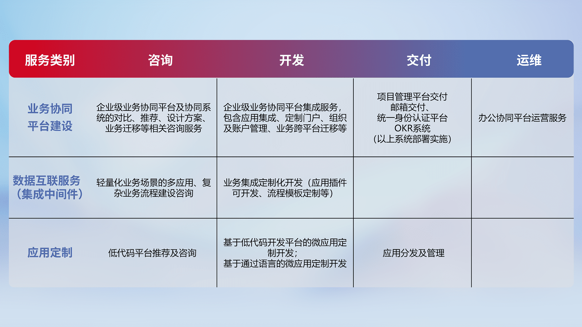 针对钉钉、、企微、、、、IDaas等平台级产品提供产品的规划、、方案、、、、交付、、、、定制化开发等服务,,,,实现如统一协同办公、、、、智能客户服务、、混合会议管理、、、、智能数据查询、、、、等业务场景,,,,实现数字化转型。。